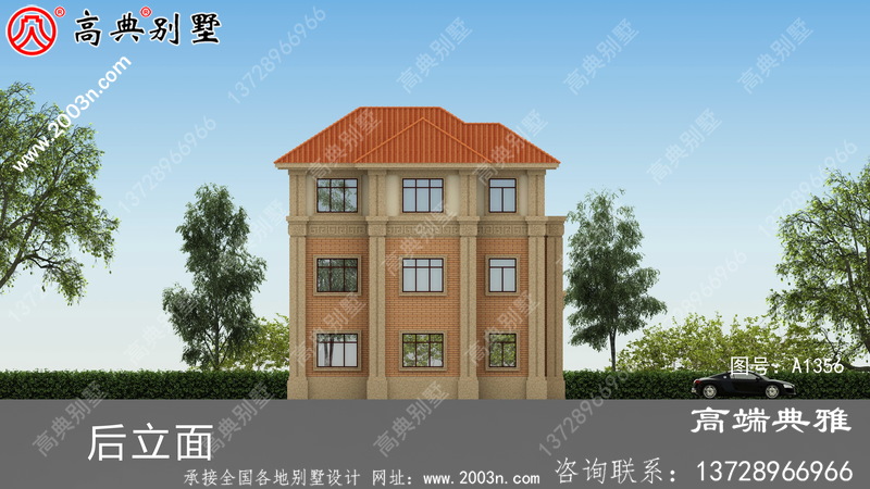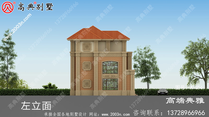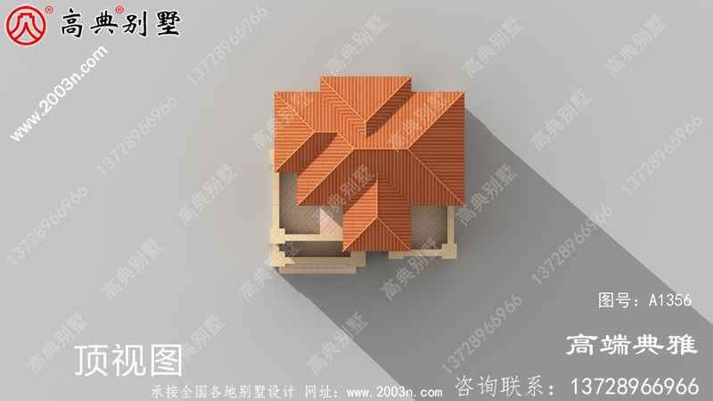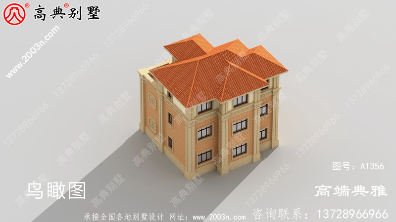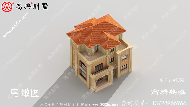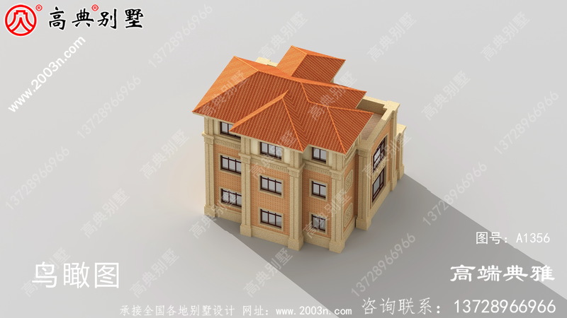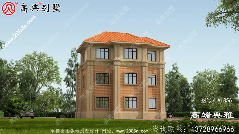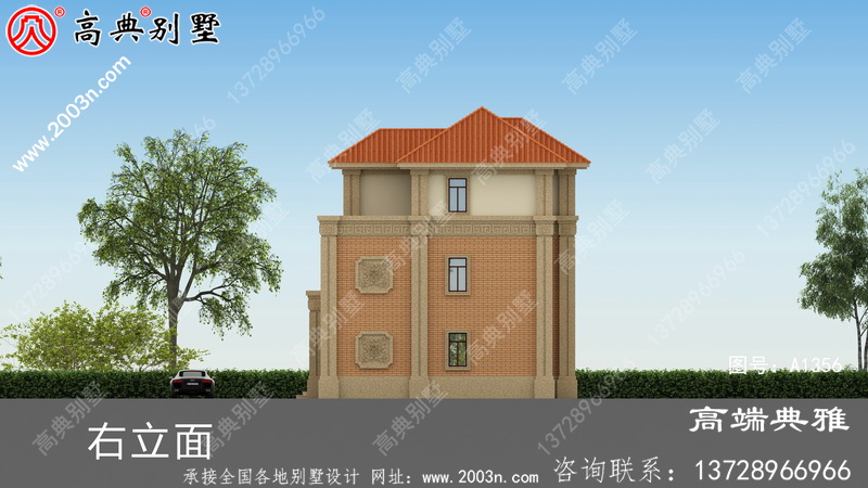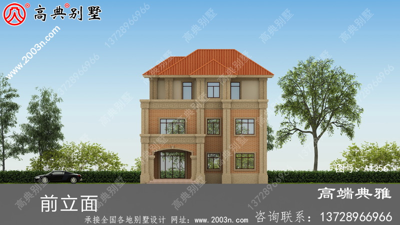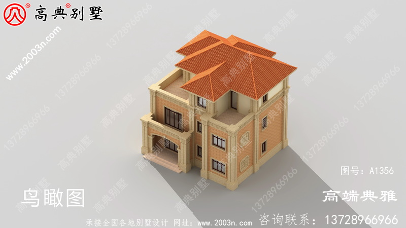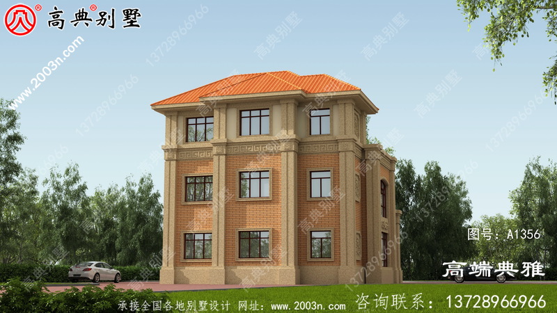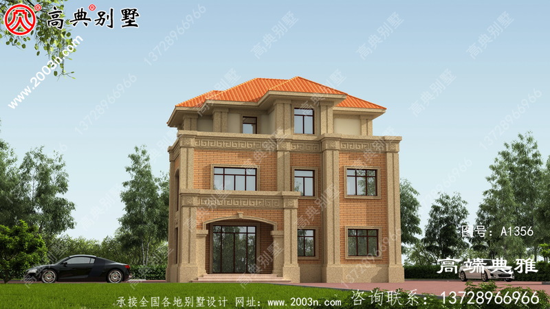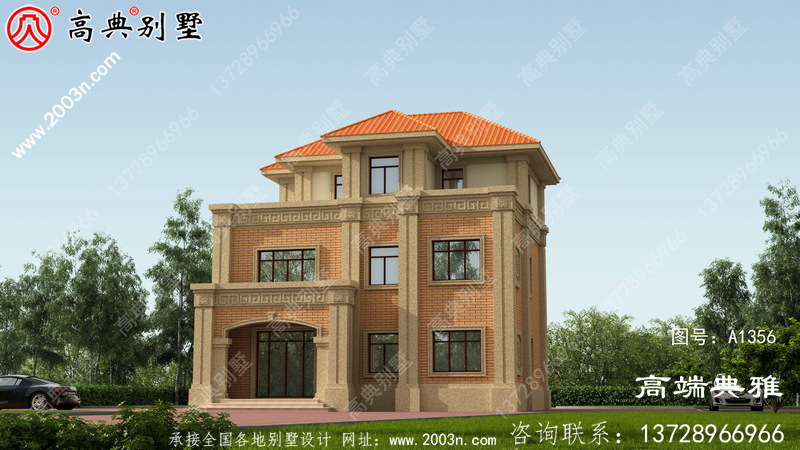 A1356号别墅外墙主要材料:水泥构件、真石漆、310X310S瓦、劈开砖