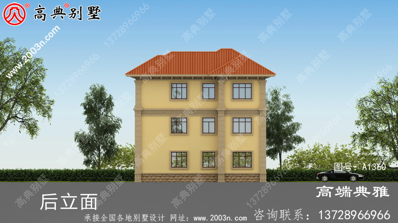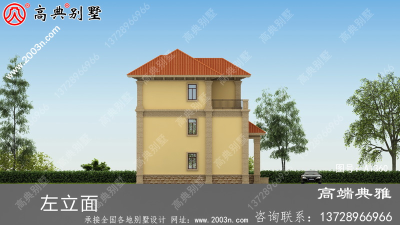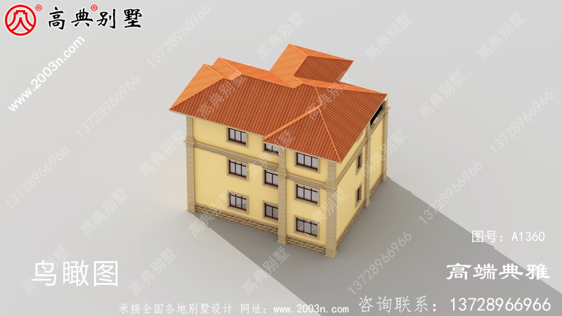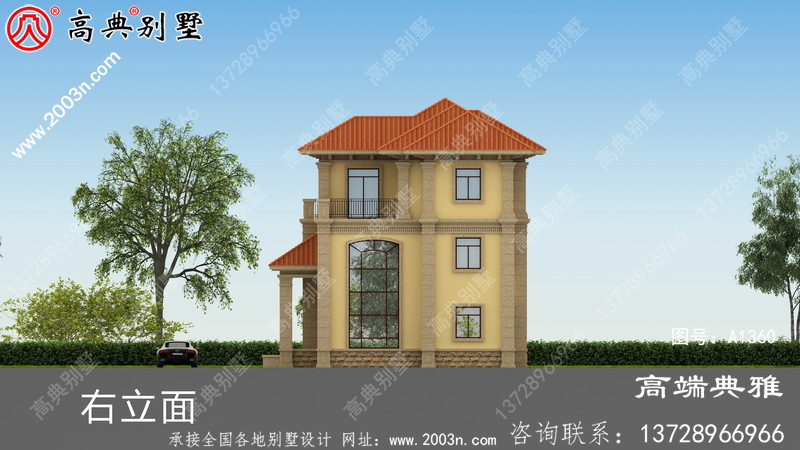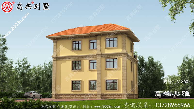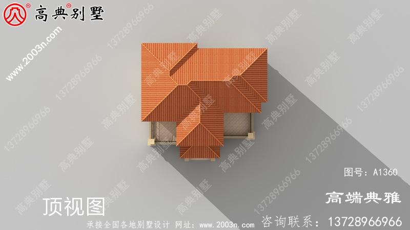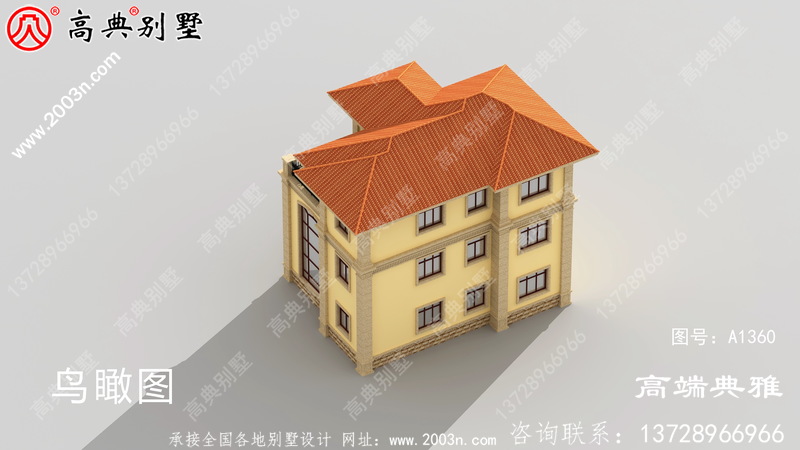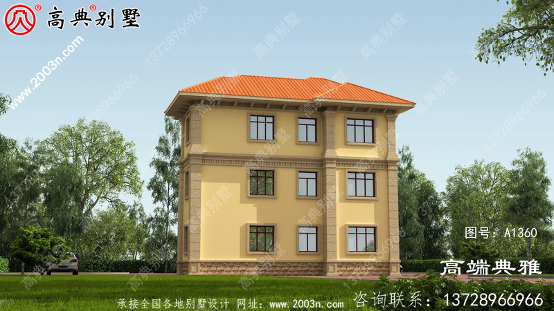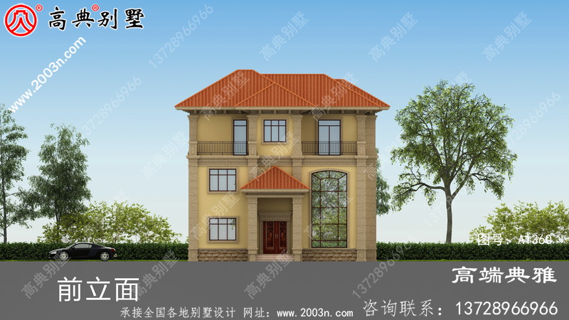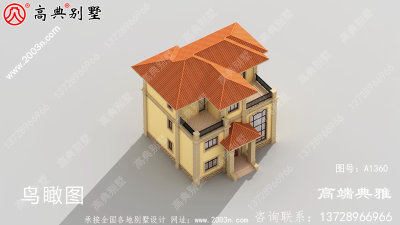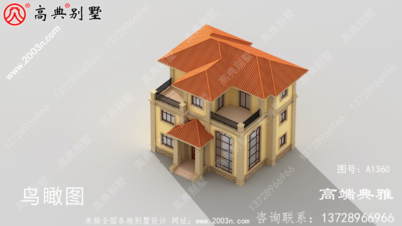 A1360号别墅外墙主要材料:水泥构件、真石漆、蘑菇面黄锈石、铁艺栏杆、310X310S瓦