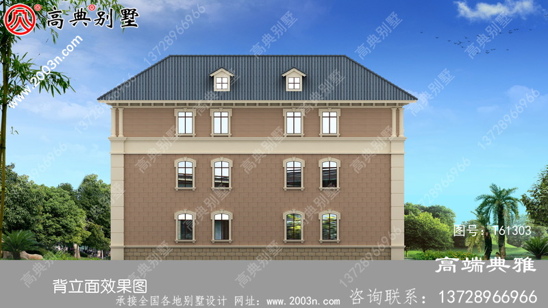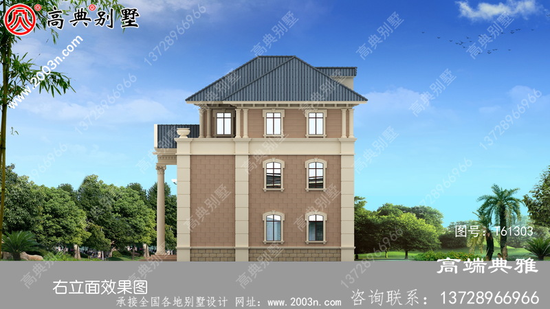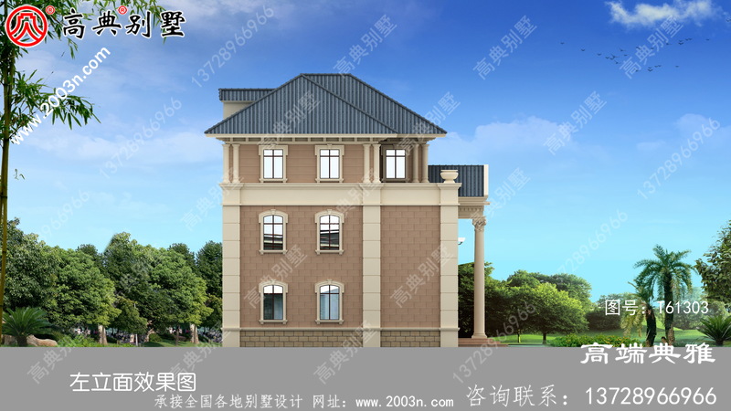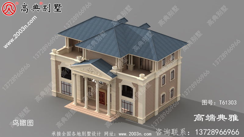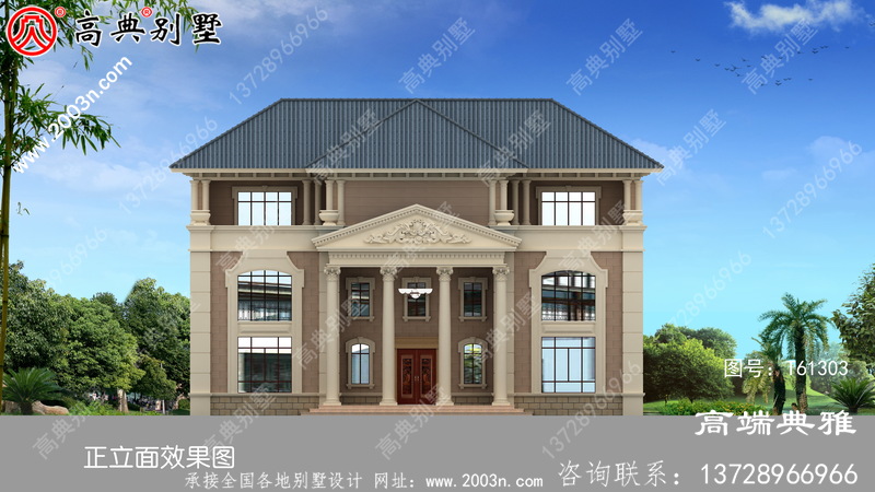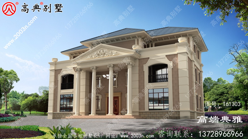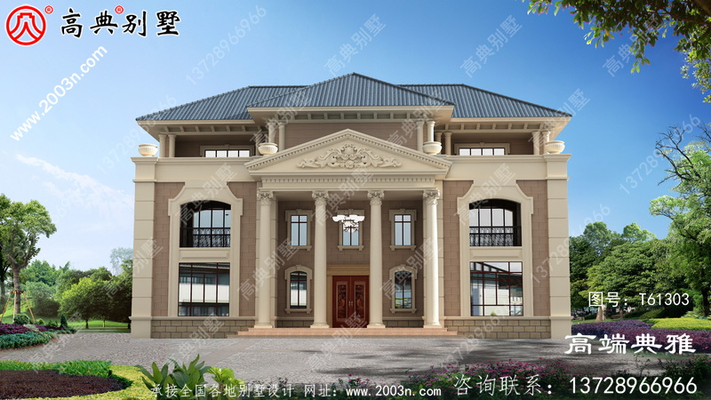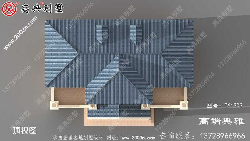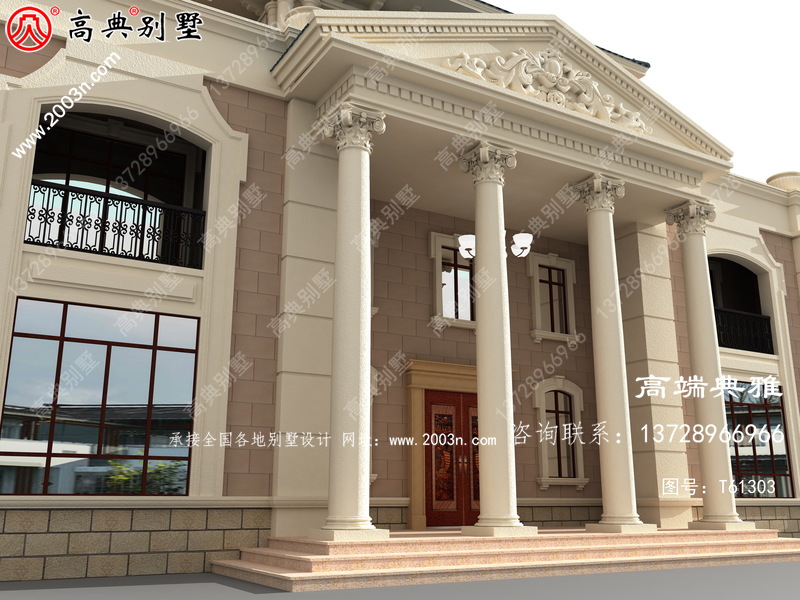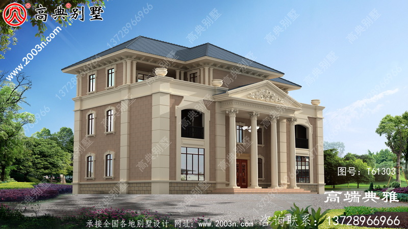 t61303号别墅外墙主要材料:天然岩石漆、天然黄锈石板材墙裙、310X310 S瓦、GRC水泥构件