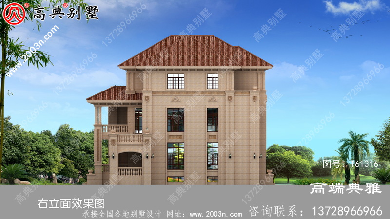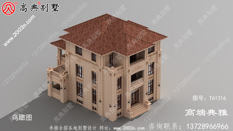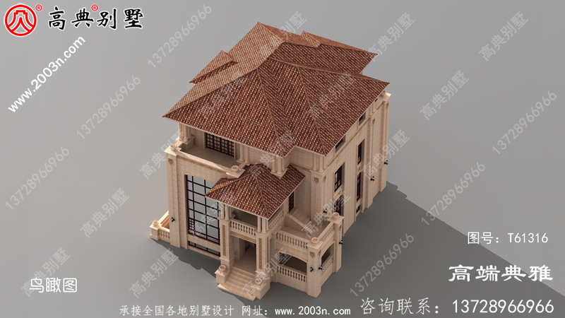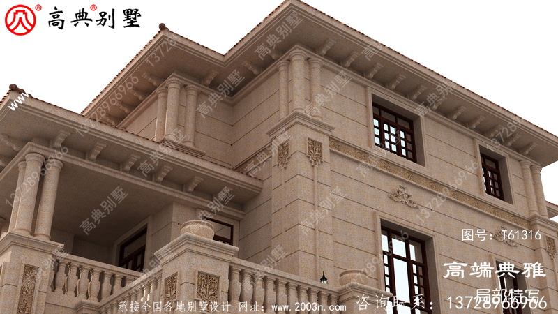 t61316号别墅外墙全部采用荔枝面沙漠棕石材干挂、外墙纯石材别墅、屋面用西班牙筒瓦
