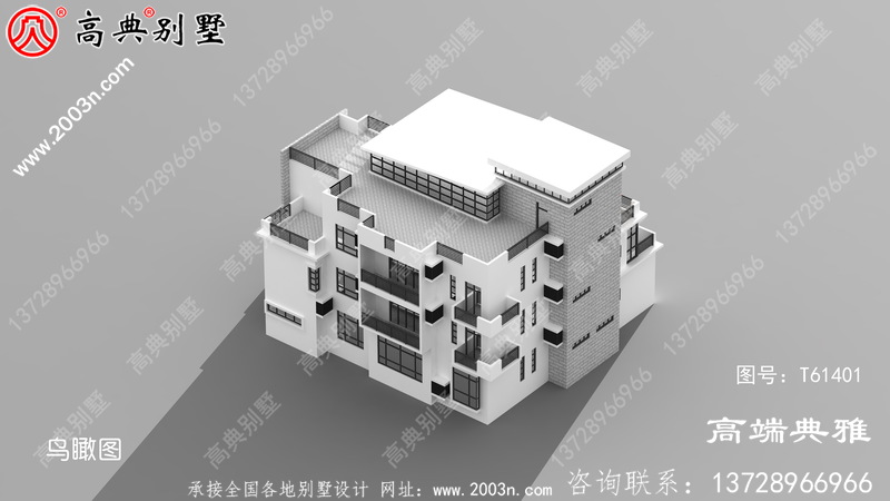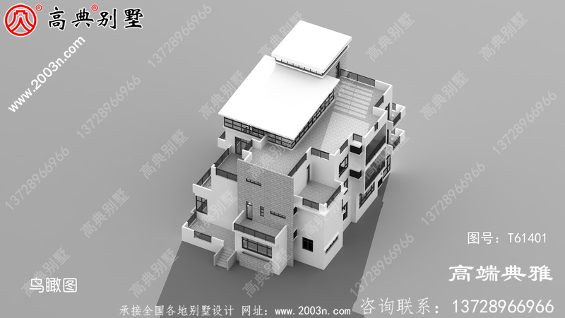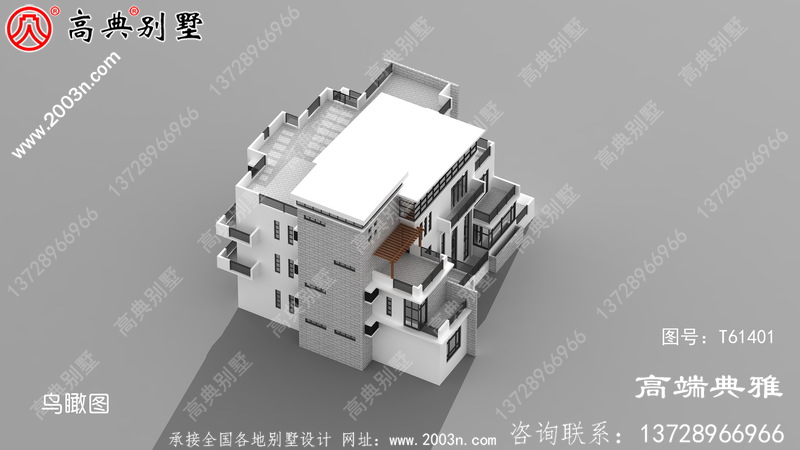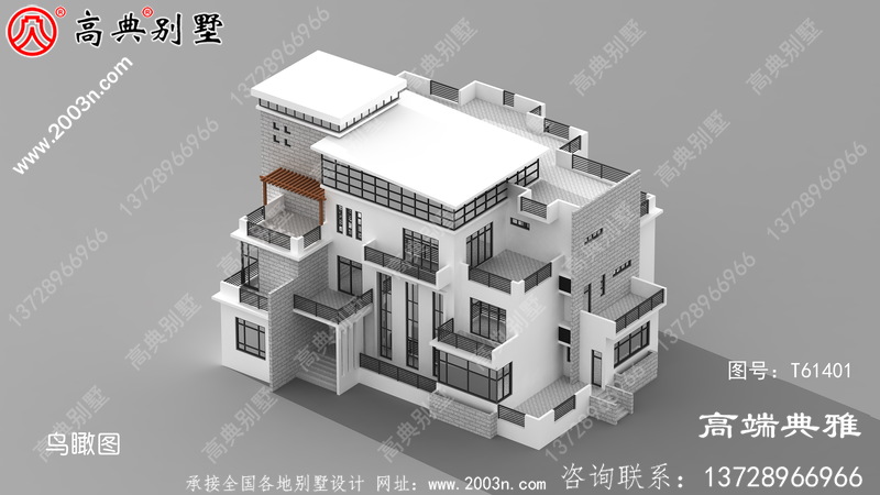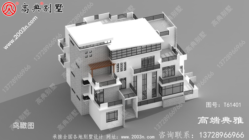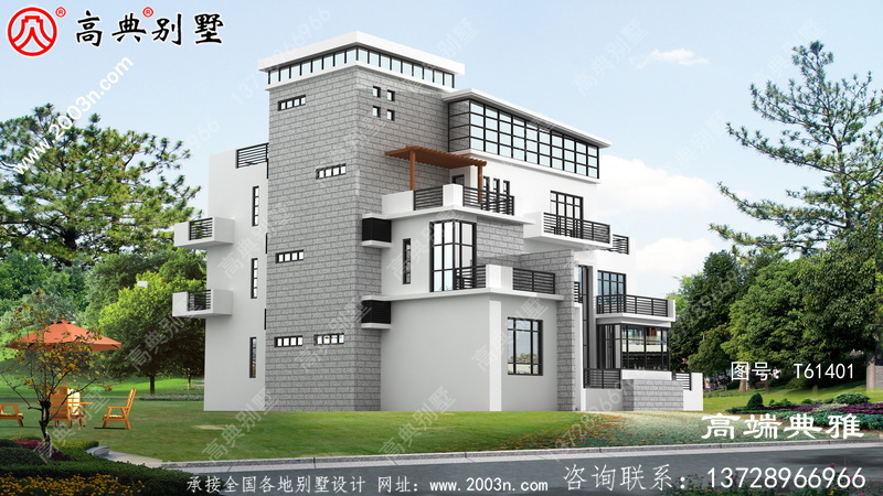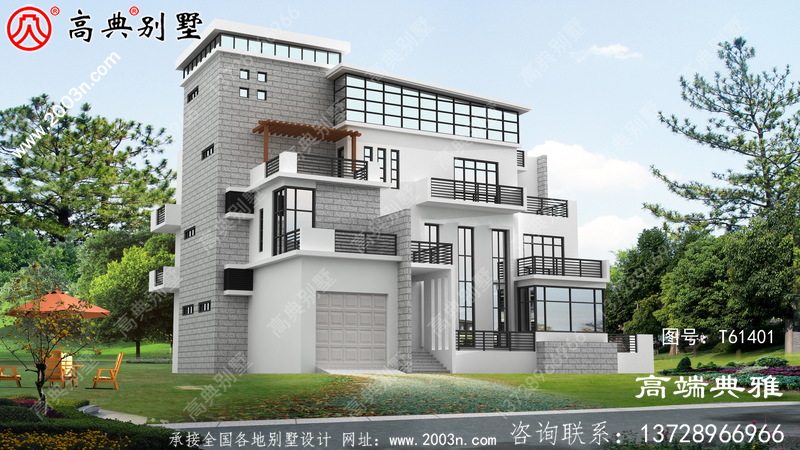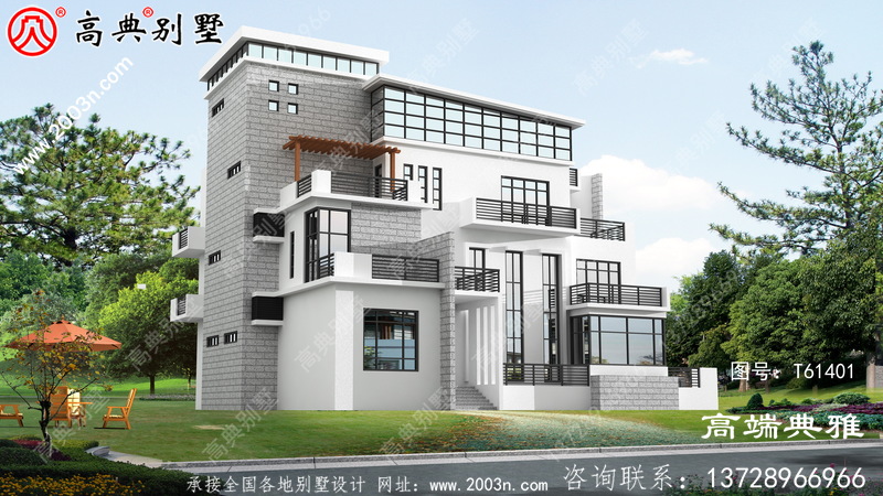 t61401号别墅外墙主要材料:天然岩石漆、荔枝面白麻石板材、铁艺栏杆